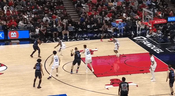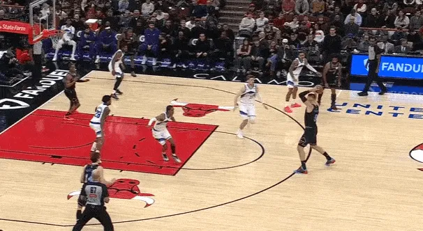 琼斯LOGO位置持球和武器发动挡拆配合,行进间吸引双人防守后立即找到外弹至弧顶的武器,武切维奇接球三分手起刀落。