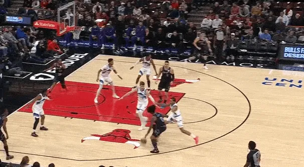 琼斯LOGO位置持球和武器发动挡拆配合,行进间吸引双人防守后立即找到外弹至弧顶的武器,武切维奇接球三分手起刀落。